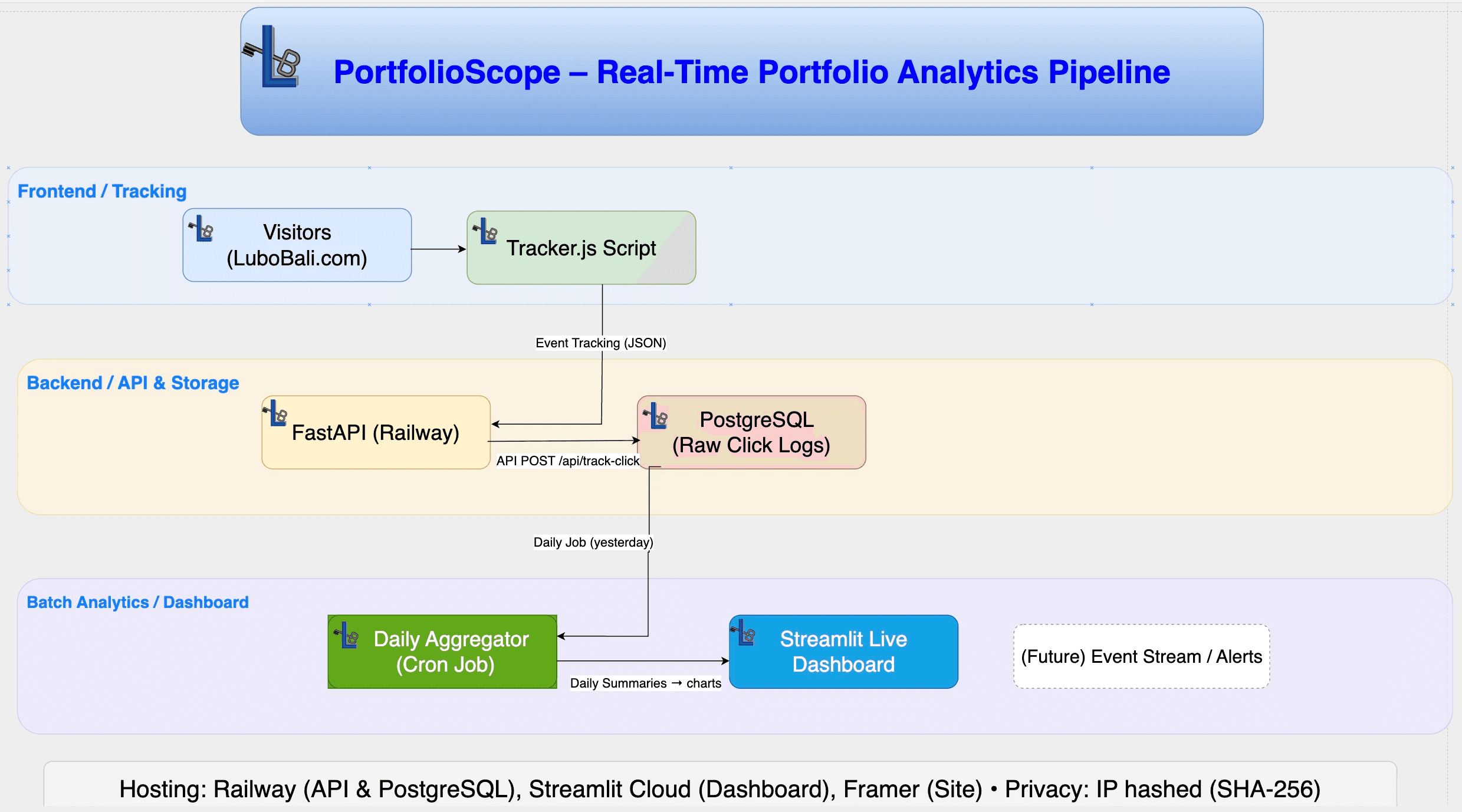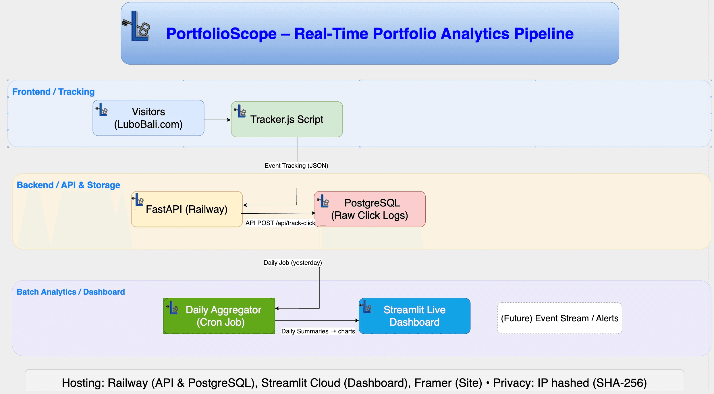 Built from scratch with JavaScript tracking, FastAPI backend, and smart ETL pipelines, it transforms thousands of daily events into actionable metrics like session duration, traffic sources, and user engagement patterns. Whether you're a developer or business analyst, this pipeline demonstrates complete data ownership that scales.